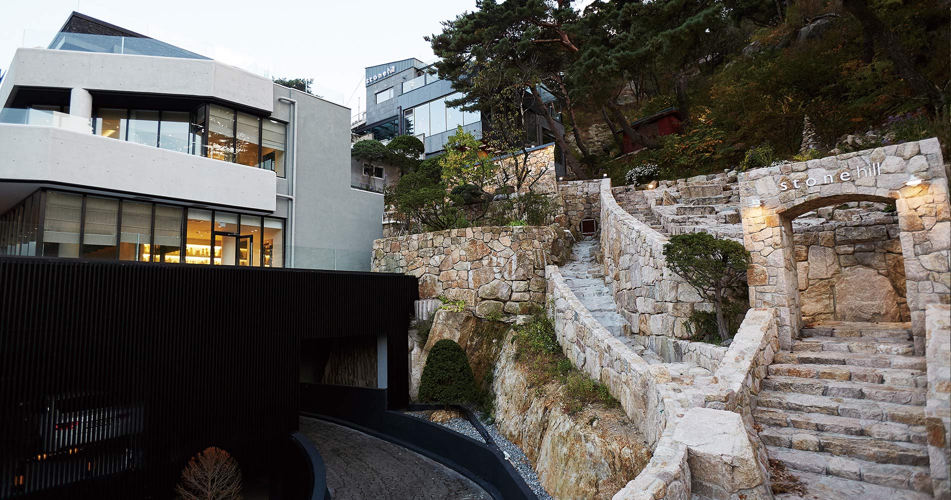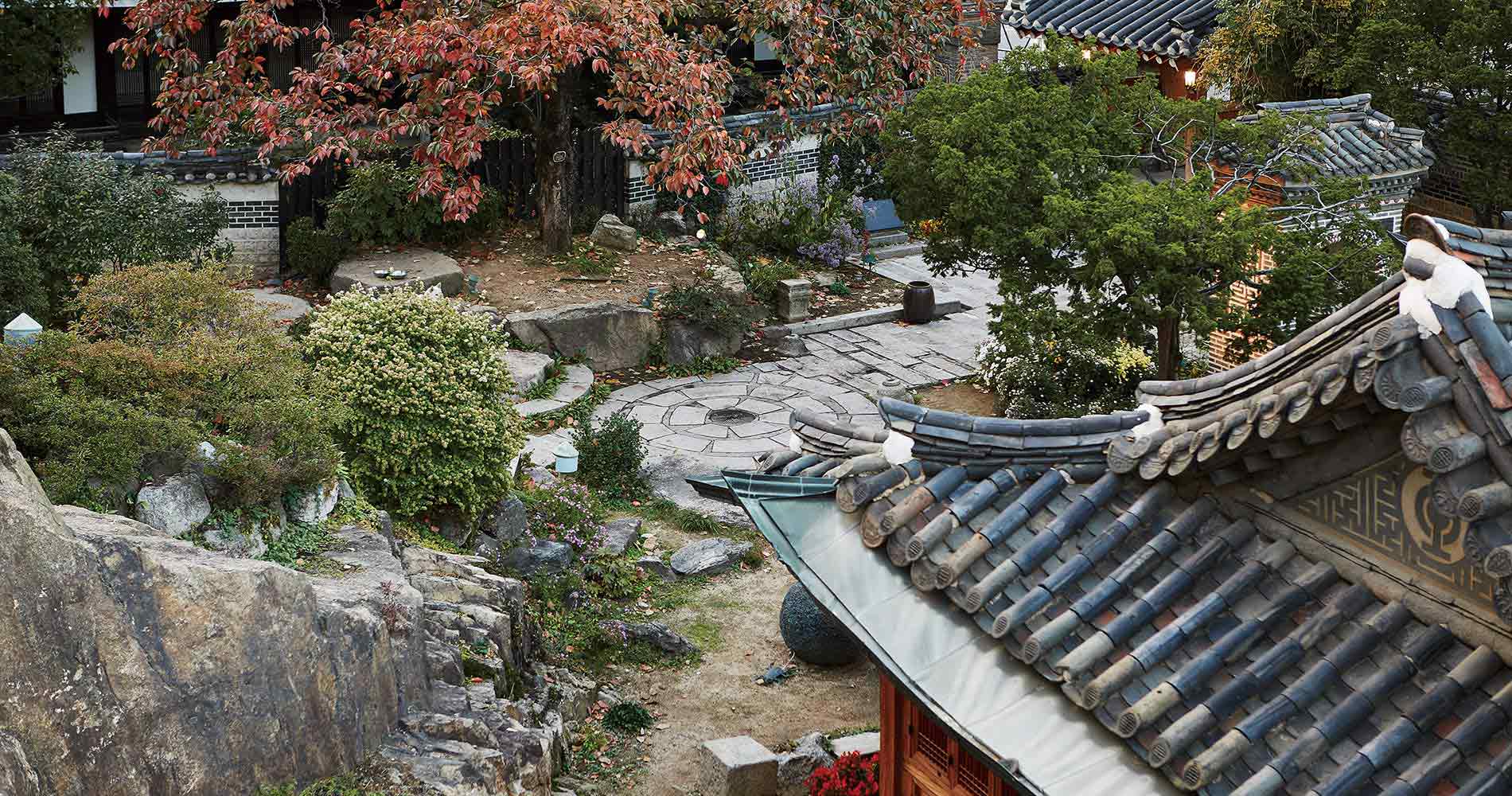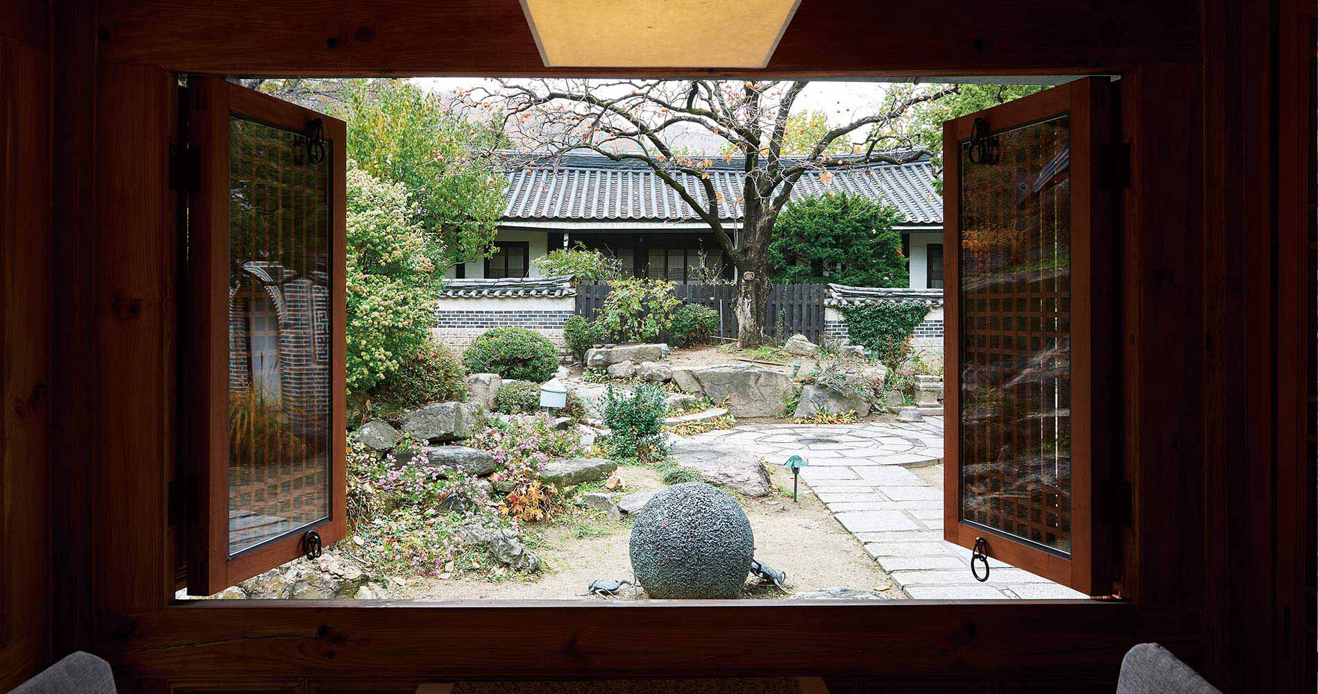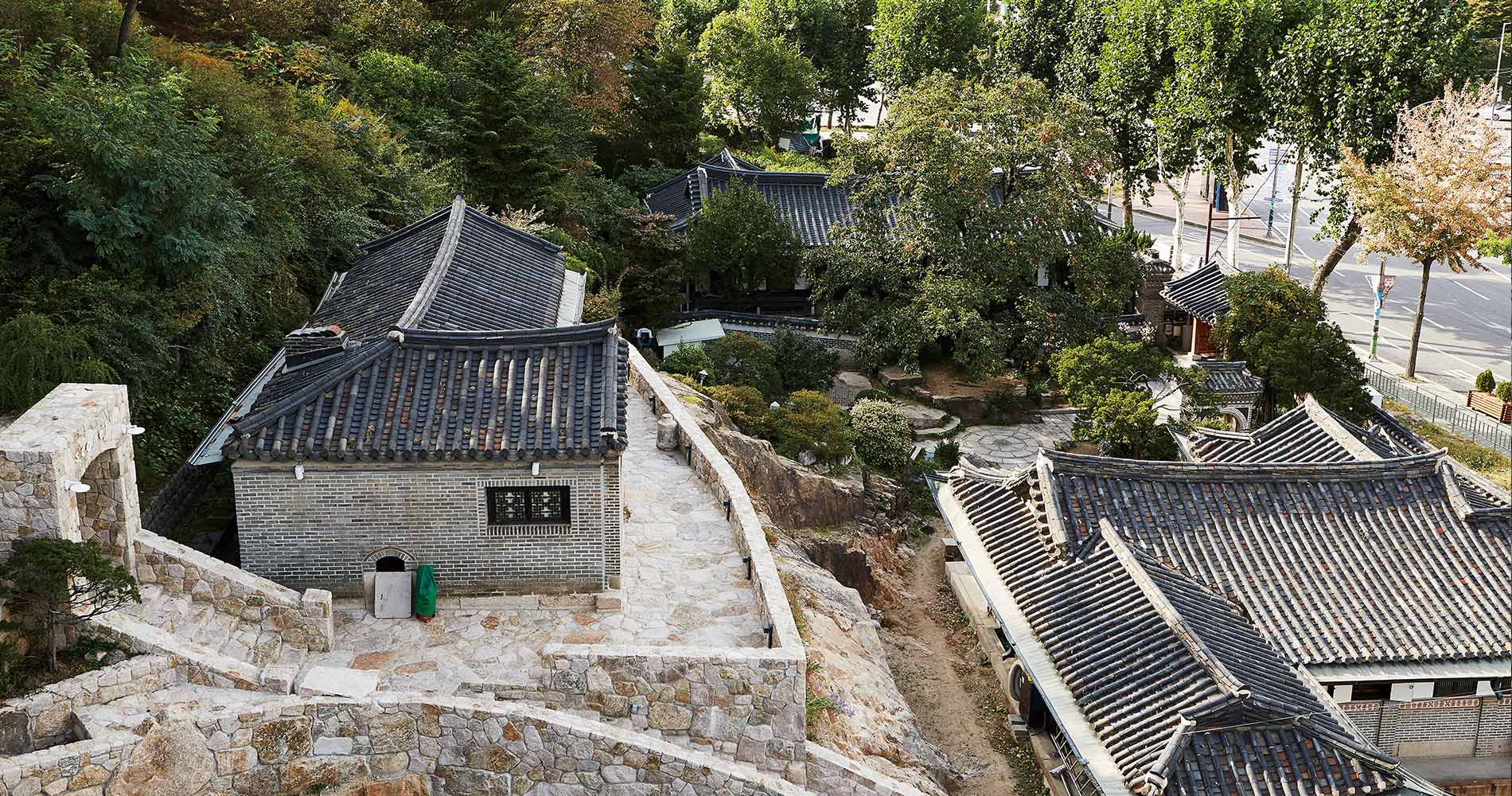 양쪽의 깍아내린 돌벽이 높은 층고에 그대로 살아있고 석파랑 한옥 정원으로 통하는 비밀스러운 길이 연결된 특별한 공간